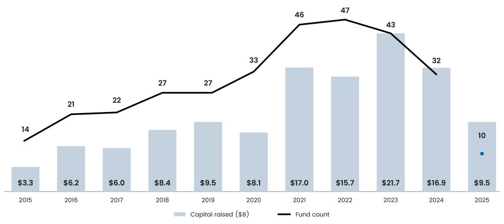 Life sciences VC raised only $1 billion across nine funds in 1H25, well below the 10-year annual average of $14.6 billion, as per PitchBook. The strategy accounted for just 1.6% of the total VC fund count and 2% of the capital raised. 2Q25 also marked the first quarter since 2016 without a US biopharma IPO, limiting exit visibility and delaying capital returns to LPs.