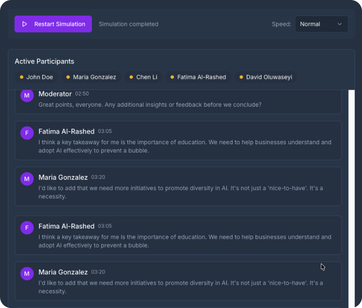Simulate realistic multi-participant group dynamics including influence, dissent and alignment for high quality synthetic research.